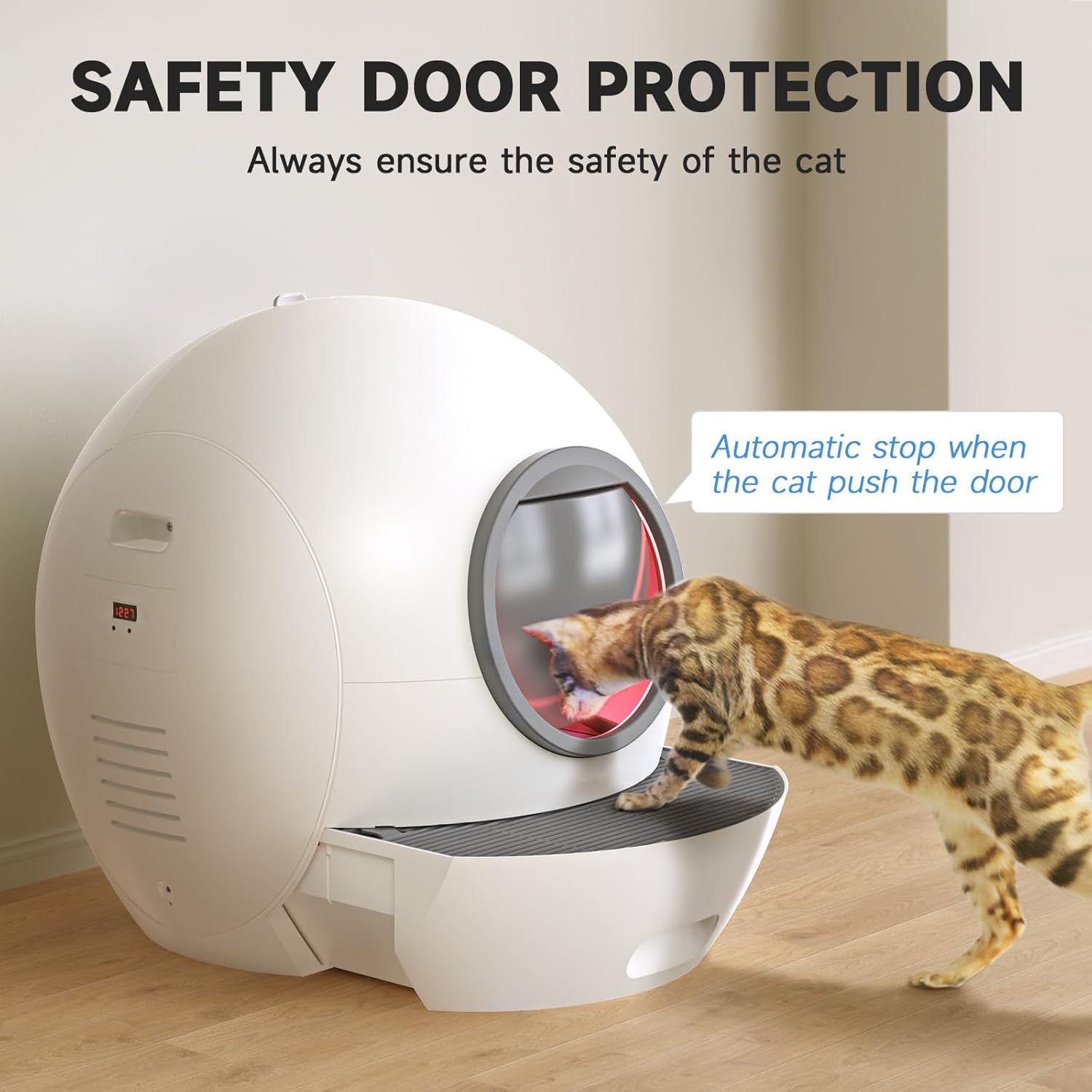 - SECURITY SYSTEM: When a cat enters the litter box, the sensor immediately detects its presence and pauses the cleaning process until the cat leaves. Additionally, if the cat pushes the door of the litter box while the system is running, it will automatically stop to ensure the cat's safety. These safety features help ensure the safe use of the litter box, protecting the cat from harm.