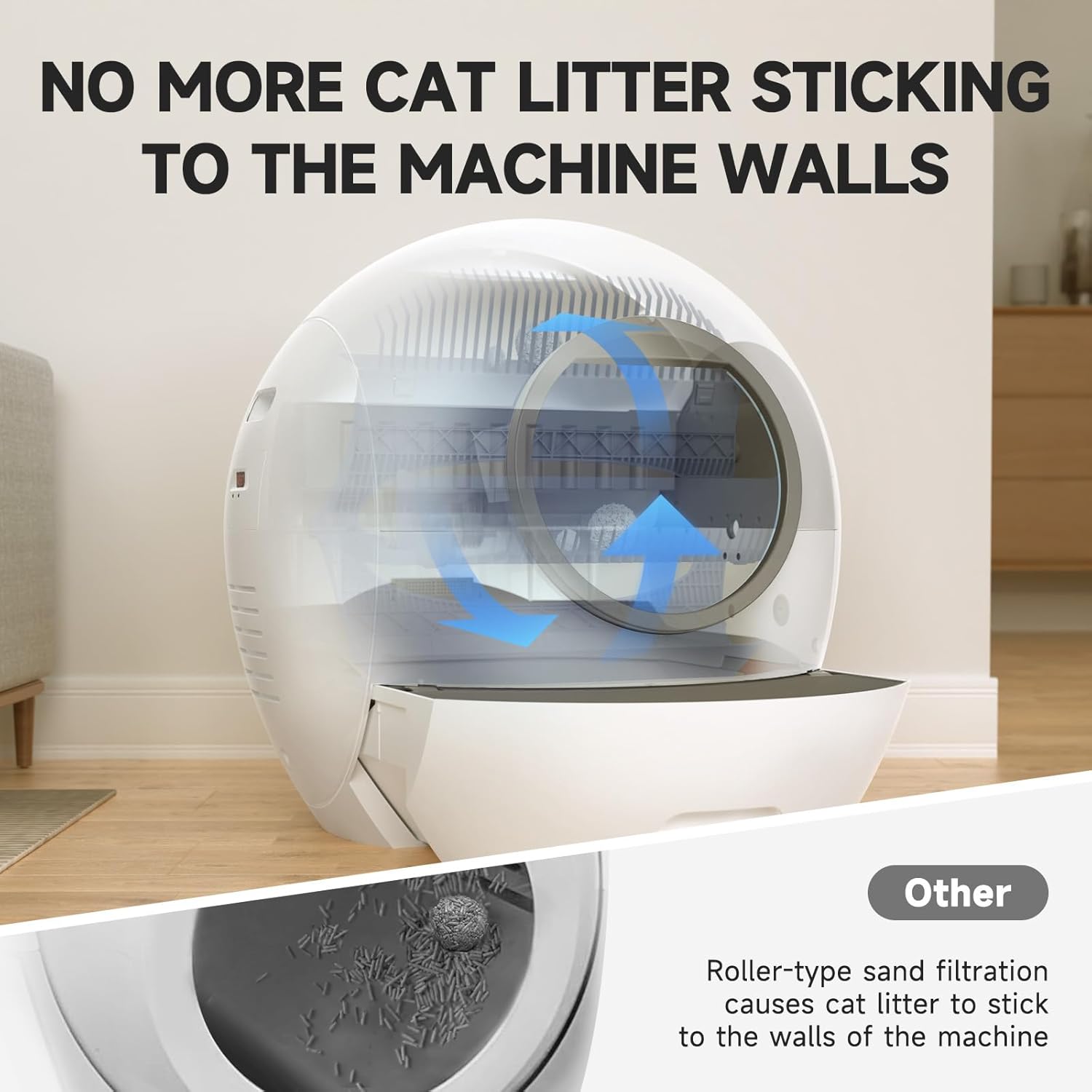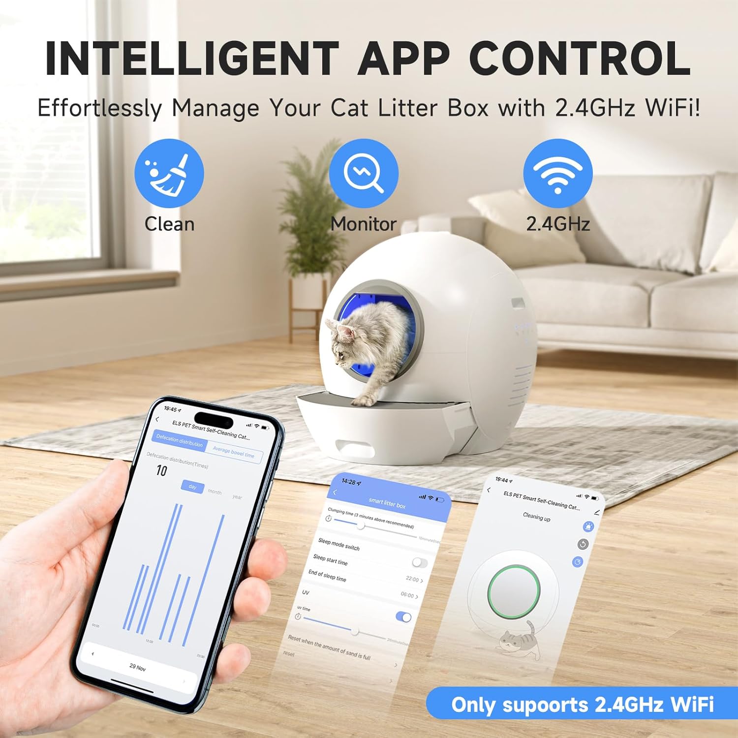- SMART APP CONTROL: Our cat litter box automatic cleaning can connect to Wi-Fi(2.4 GHz only), allowing cat owners to monitor and control the litter box from their smartphone. Cat owners can check on the litter box's cleaning status, and adjust cleaning settings. By offering Wi-Fi connectivity and smart features, an automatic cat litter box can provide added convenience and control for cat owners, making the litter box experience even more hassle-free and customisable.