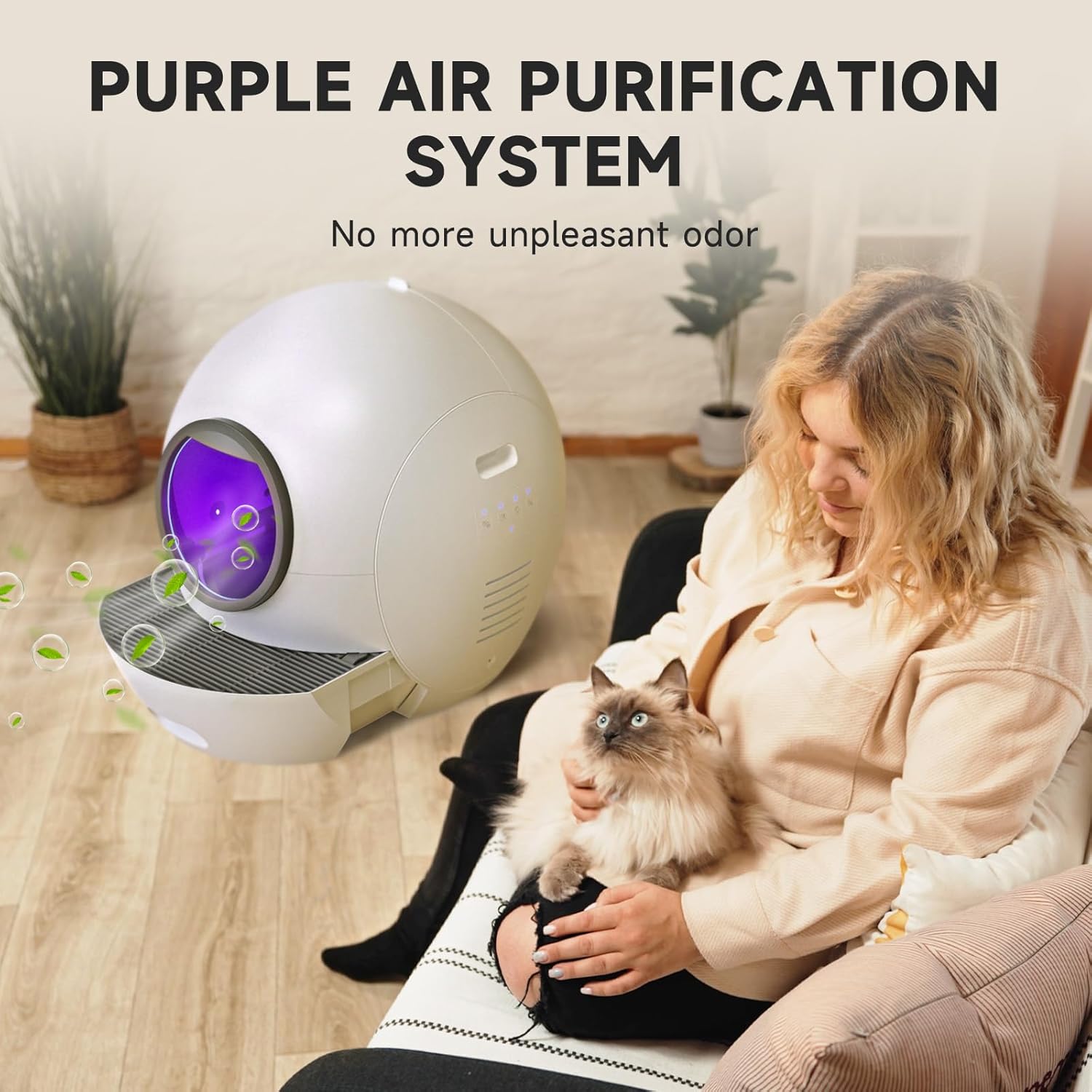 - 60L EXTRA-LARGE CAPACITY: 60 L Spheric Space, This applies to cats from 1.5kg to 13kg. 4L capacity of trash box means no scooping, cleaning or refilling cat's litter box for two weeks. (First Time Users Tip: Pull out the pedestal of the cat litter box until both sides of the buckle on the pedestal are stuck, and hear a "BEEP" sound, the light inside turns from red to blue.)